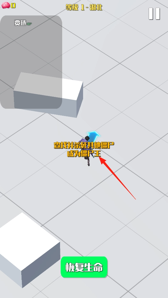 2、在湖北地图中搜寻其他僵尸进行对决,贾胜是你的第一个目标。若血量不足,可点击恢复生命按钮;左上角会显示你收集的大脑数量,要成为僵尸王,就得击败所有竞争对手。
