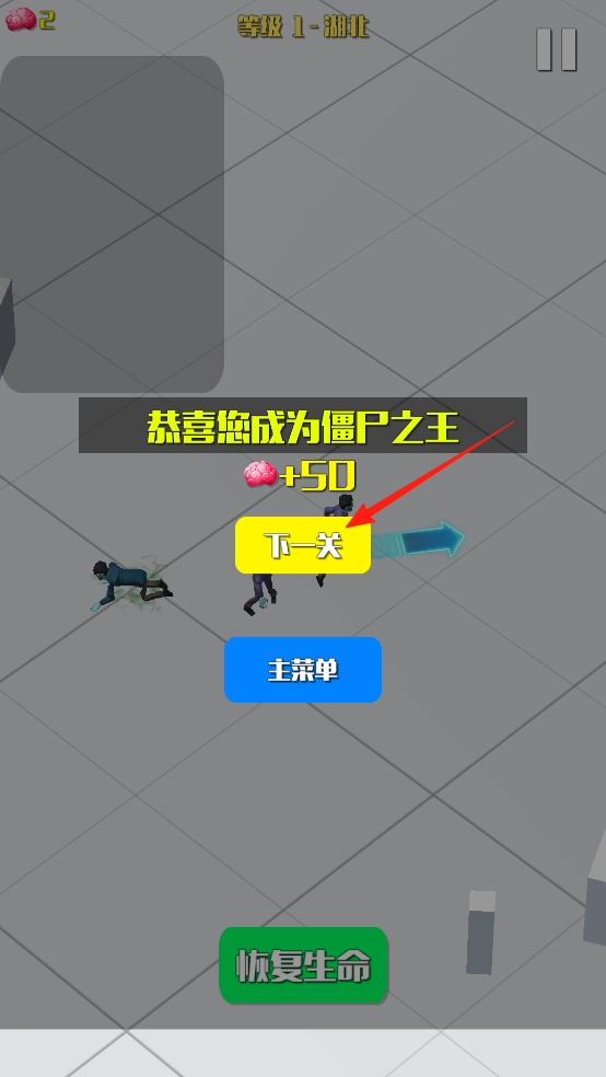 3、成功成为僵尸王可获得50个大脑作为奖励,若想继续挑战,点击下一关按钮即可;主菜单支持查看所有成就,恢复生命的功能在每关结束后都能免费使用一次。
