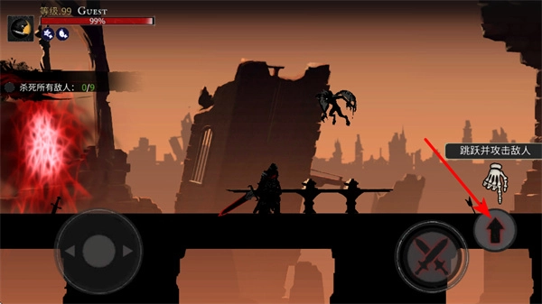 3、跳跃攻击点击跳跃按钮,跳跃并攻击敌人,可对空中或高处的敌人造成伤害,拓展范围。