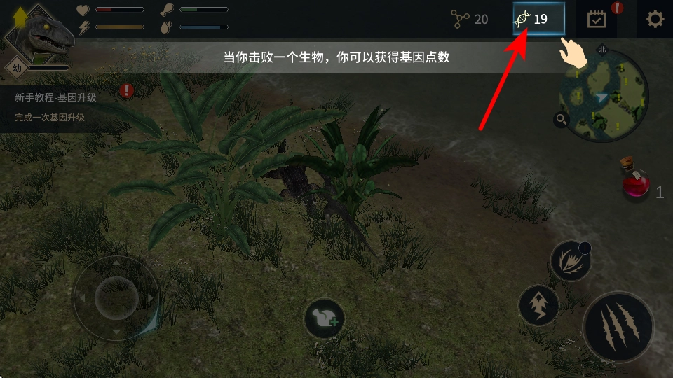 1、在游戏里击败生物能够得到基因点数,获得后要留意基因点数的累积状况,以便为强化恐龙属性做好准备。