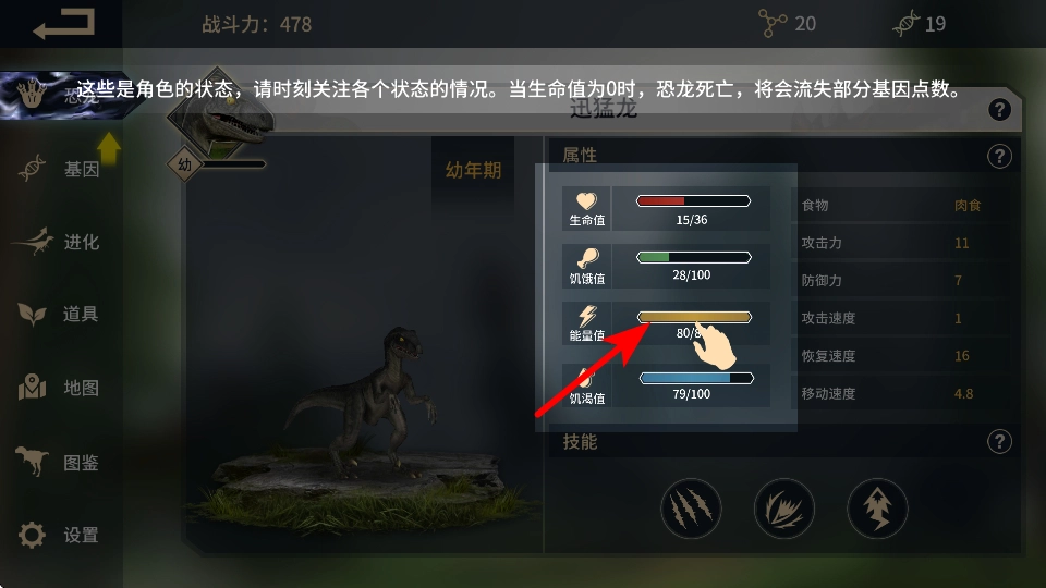 3、要时刻留意恐龙的各项状态,一旦状态值偏低,就得及时采取应对措施,防止恐龙死亡导致基因点数损失。