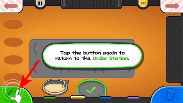 3、完成当前工位操作后,紧跟红色箭头指引,点击左下角的按钮返回订单站,切换到接收顾客订单的场景。
