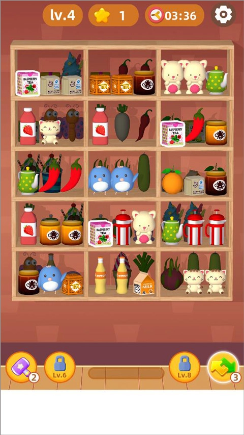 进入游戏后,把三个相同的物品放在一块儿就能消除它们了。