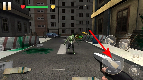 进入关卡后,点击右侧的武器按钮(例如手枪),瞄准出现的怪物进行射击,通过消耗弹药来消灭敌人。