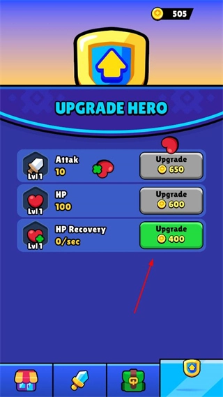 4、进入升级英雄界面,选择HPRecovery选项,点击其对应的Upgrade按钮提升该属性。