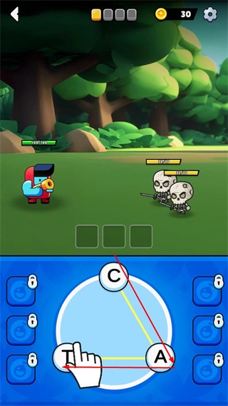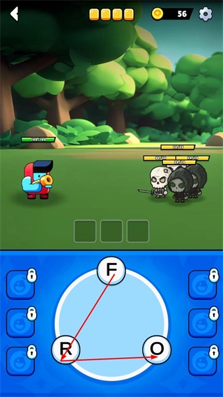 1、在游戏界面下方的字母圈中,按提示拖动字母拼接成单词,完成拼写后触发战斗攻击。