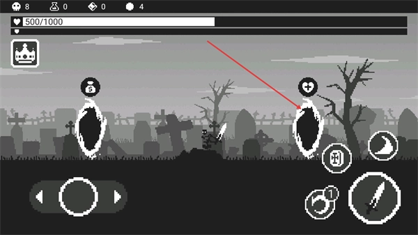 当前界面会显示剩余敌人数量,你需要操控角色靠近骷髅敌人并将其击败,之后就能拾取地面掉落的白色金币来获取奖励。
