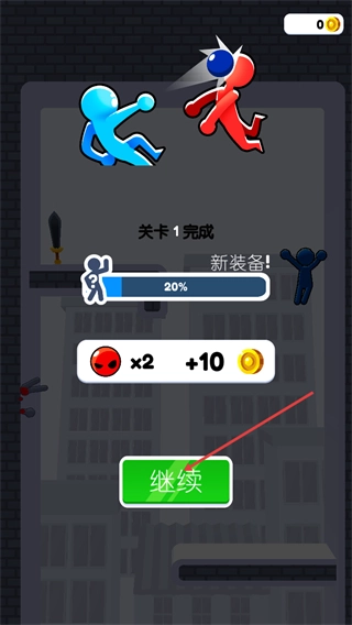 界面显示关卡1已完成,你获得了相应的奖励和新装备,点击绿色的继续按钮就能进入下一关。