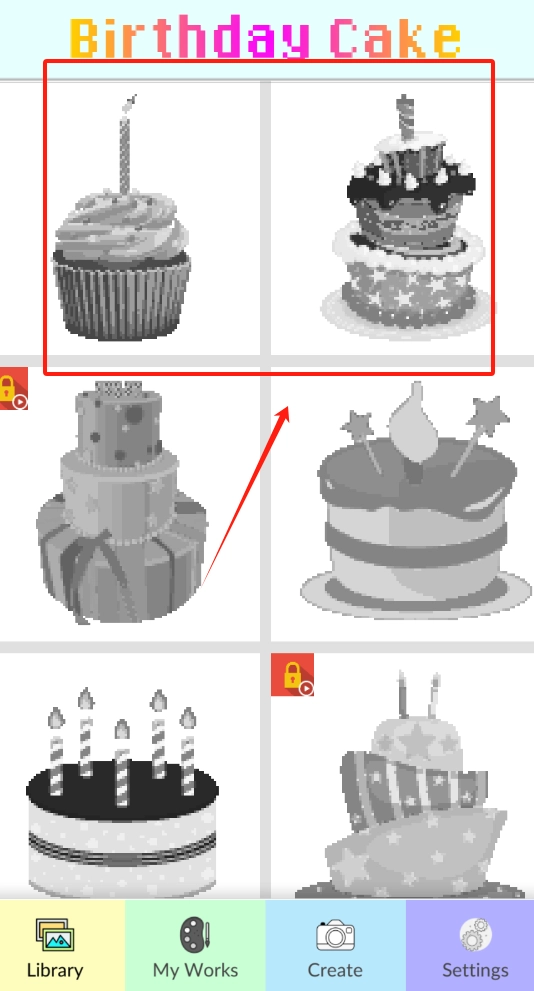 1、点击生日蛋糕界面,选择未解锁的蛋糕进行涂色,底部的按钮能够切换不同功能。