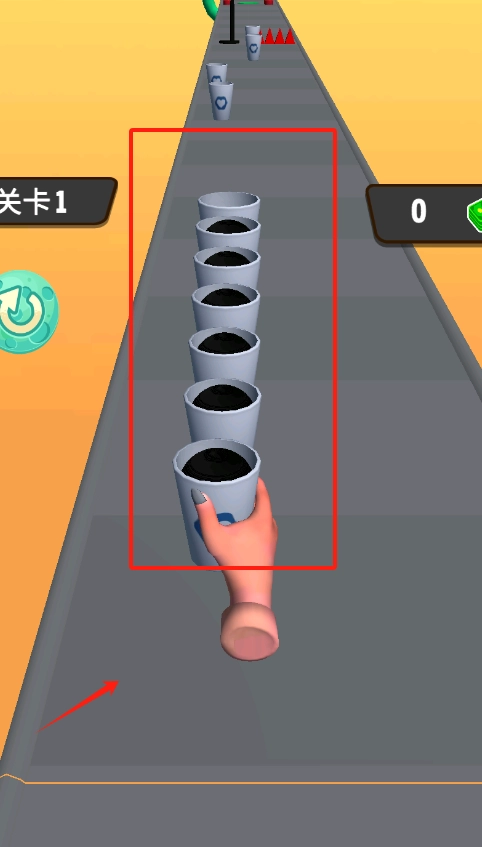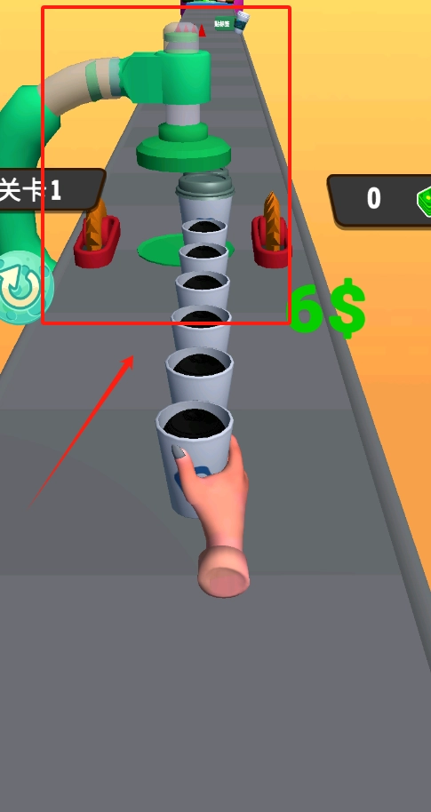 3、传送带上杯子排成一列,看上方绿色机械装置提示,用手指点下方伸向杯子的手,控制杯子完成关卡得分。