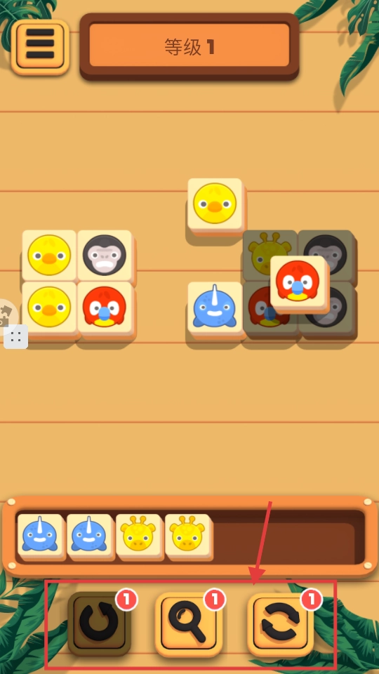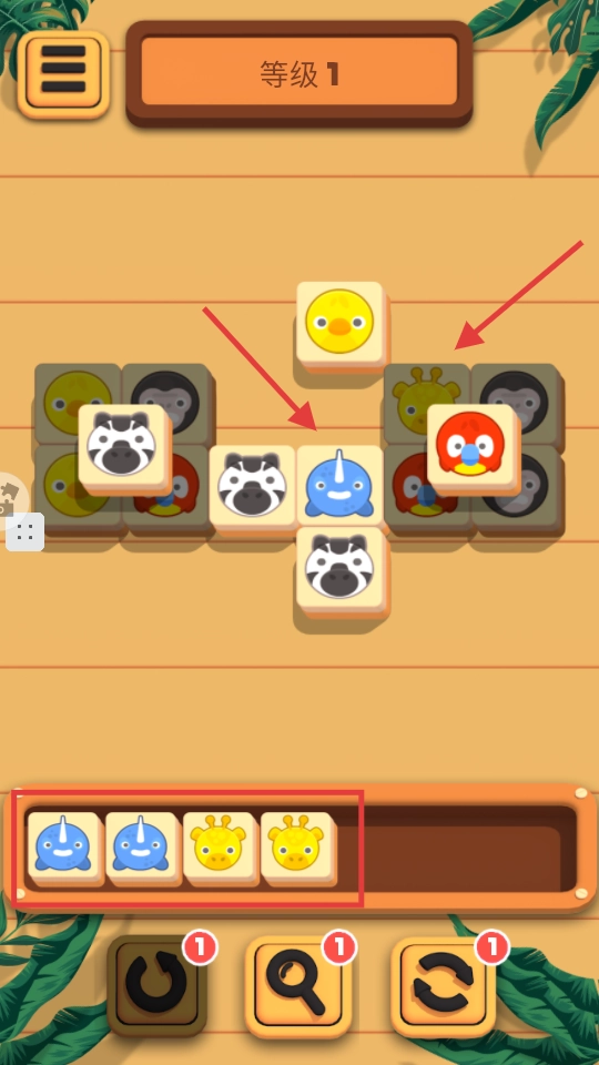 当消除遇到阻碍时,可以借助底部带有【1】标识的道具来调整方块的位置,从而帮助凑齐3个相同的动物进行消除。