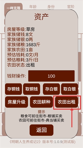 在资产界面点击【农田出租】按钮,能够获取稳定资源,为初期资产积累和后续发展提供助力。