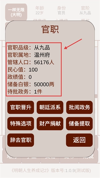 官职界面上能看到【从九品】的品级以及【民心值】等相关信息,点击界面中的【批阅政务】选项,就能增加政绩值,进而推动官职的晋升。