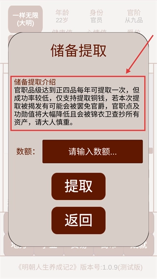 储备提取需满足【正四品】品级要求,每年仅限一次且存在风险,输入数额前请务必仔细阅读规则。