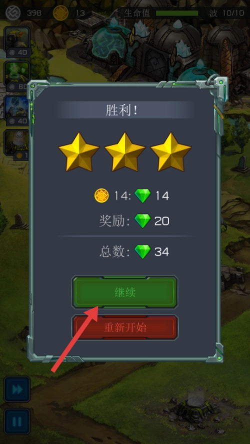 关卡获胜后点击【继续】按钮,领取对应的奖励,进而开启全新的关卡挑战。
