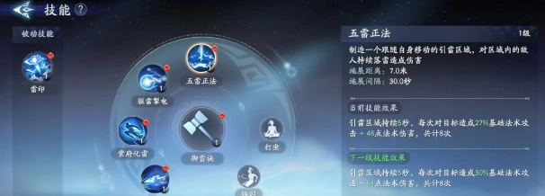 第一个主动技能五雷正法,能生成一个引雷区域,此区域会随玩家同步移动,区域内的所有敌人都会持续遭受落雷攻击。在技能等级为1级时,引雷区域的持续时间为5秒,期间总共会造成8次伤害。
