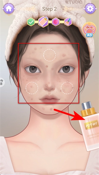在美容第一步的界面中,找到红色箭头所指向的针具工具并点击它,接着使用该工具处理角色面部的痘痘,这样就能完成第一步的美容操作了。