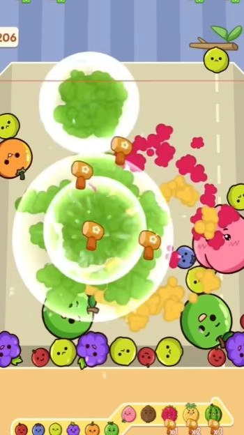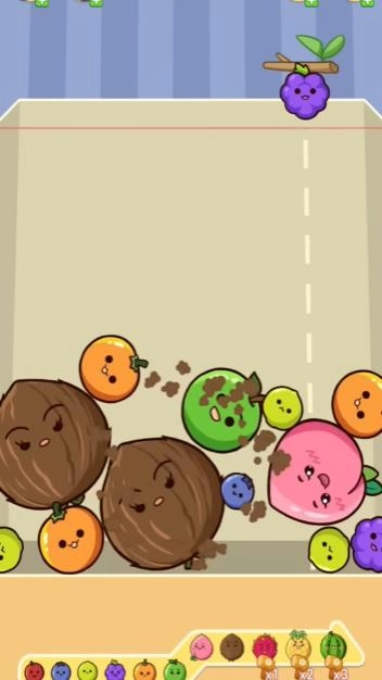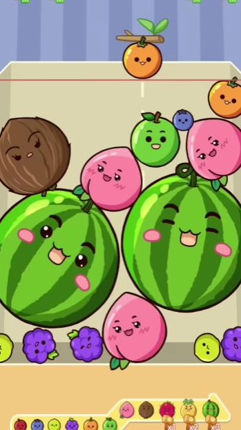 拖动屏幕或者点击屏幕,就能让水果从顶部掉落。2、只要有三个相同的水果相邻,就可以合并成更高级的水果。3、借助道具能够加快合并的进程,或者清除掉那些起到障碍作用的水果。