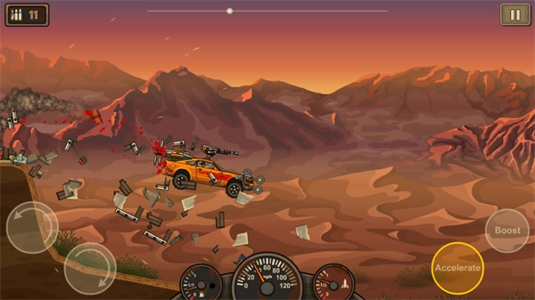 游戏采用横版闯关的玩法,玩家需要同时操控车辆移动与武器攻击。