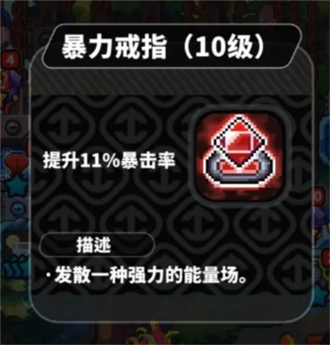 7、暴力戒指具备提升暴击率的效果,若想借助多次暴击实现秒杀boss的目标,前提是自身基础面板数值足够高,不过在游戏前期并不建议佩戴该戒指。