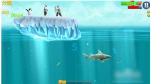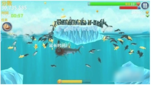 在南极存在一个小技巧:初次进入北极场景时,冰面上会出现一些雪人和企鹅,先别急着吃掉它们,继续向左游动到场景的最边缘,这时画面会自动拉近。等抵达左边尽头后,再折返回刚才的冰面海域,会发现岛上多了几只企鹅,还有企鹅往海里跳,不用理会也别去吃,接着再往左边游,直到看不见这个岛为止,之后再次返回,就能看到岛上的企鹅数量又增加了。像这样重复3到4次,岛上的企鹅就会大量涌现。这时候可以在岛的下方稍等几秒,等大批企鹅往海里跳、数量比较多的时候再去吃,会看到很多金色企鹅,它们能加速触发淘金币时间,这样就能获取大量金币和分数了。吃完海面上的企鹅后,还可以吃周围浮上来或掉下来的。淘金币时间结束后,再重复上面的步骤,不过之后只需要往左边走一次再回来,就能刷新出巨量企鹅了。