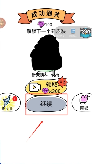 4、最后,成功通关后,点击“领取”按钮,获取奖励并解锁新皮肤,然后点击“继续”按钮,开始下一关的挑战。