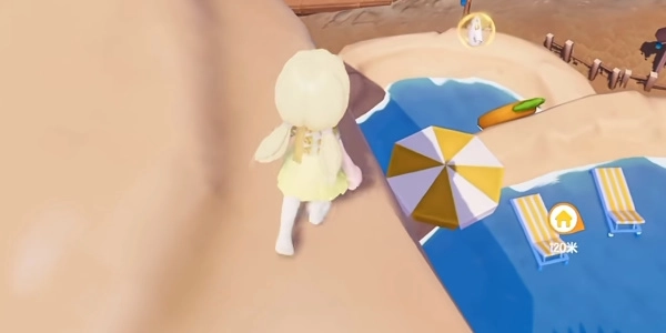 第二件泡泡服装在温泉山庄的一处太阳伞上方,玩家可以从附近的山顶跳下去拾取。