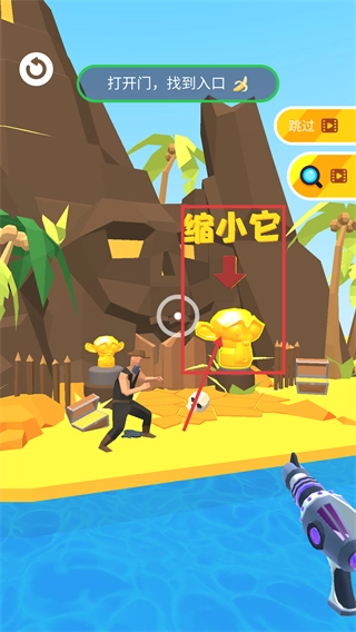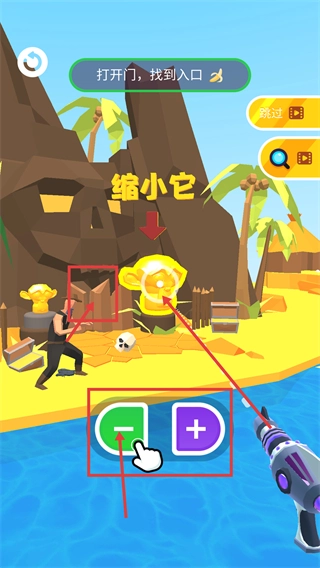 进入这一关卡后,任务是【打开门并找到入口】,要留意红色框所标注的【缩小它】提示,其对应的目标是金色雕像。