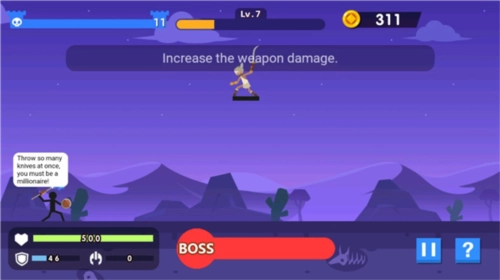 调整好角度对准敌人,投出手中的武器将他们击败,与此同时,也要留意他们的攻击,避免受到伤害。