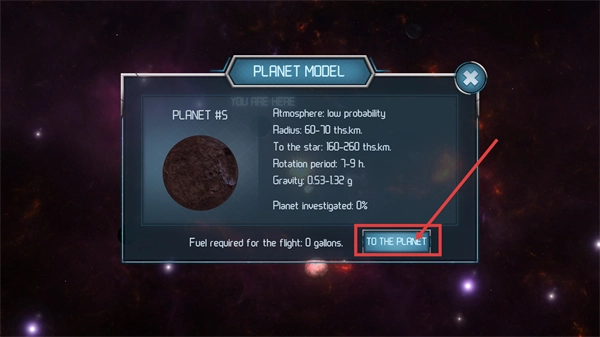 在【PLANET-MODEL】界面里,核实【PLANET-#5】的参数后,点击【TO-THE-PLANET】按钮就能前往该星球,目前飞行所需燃料为0加仑。