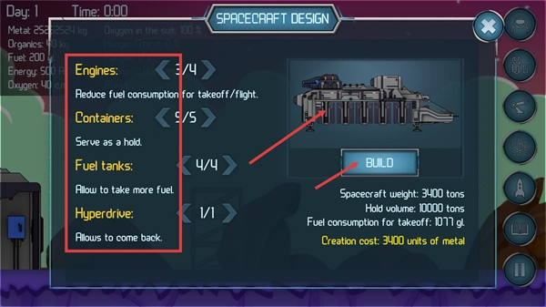 在【SPACECRAFT-DESIGN】界面完成【Engines】【Containers】等模块的配置后,消耗【3400单位金属】并点击【BUILD】按钮即可建造航天器。