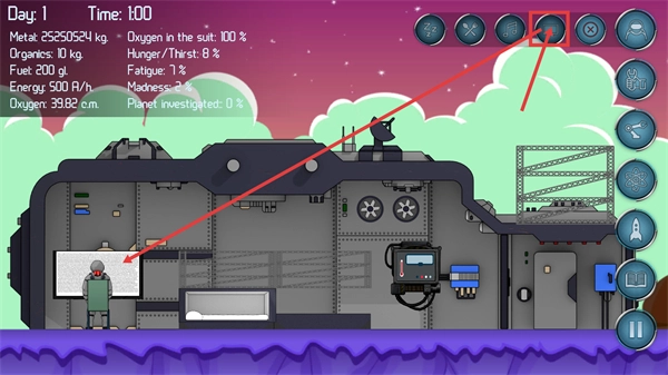 点击顶部的【电脑图标】即可唤起舱内的交互界面,另外要留意【Hunger/Thirst:8%】这类状态信息,需及时补充所需资源。