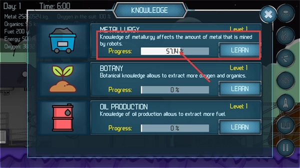 在【KNOWLEDGE】界面中,提升【METALLURGY】的进度(目前为57.14%)能够提高机器人的采矿量,点击【LEARN】按钮即可推进学习进度。