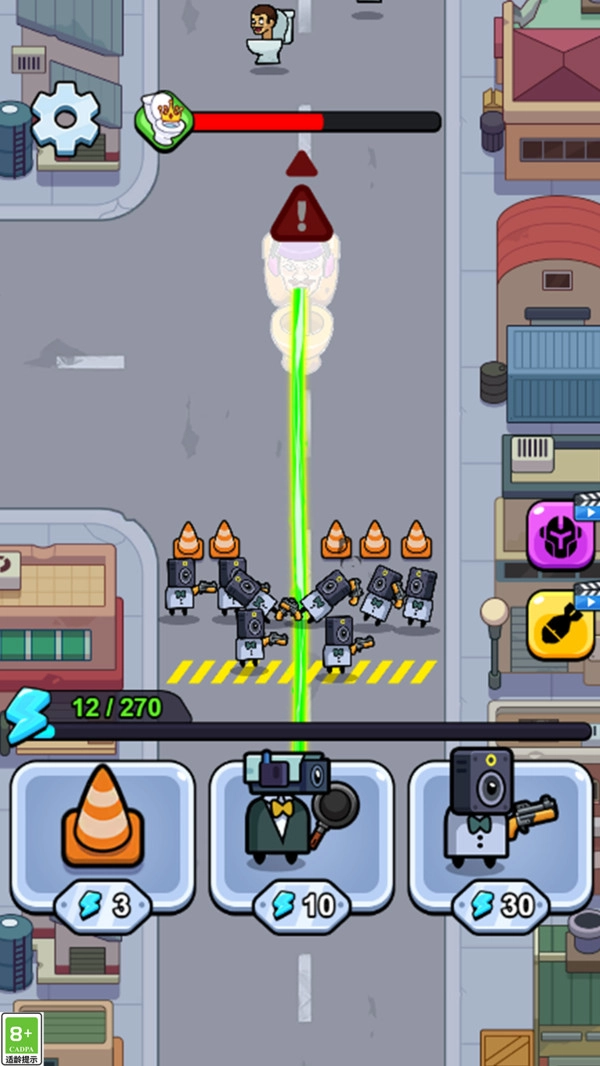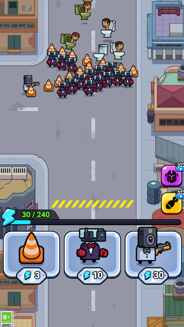 《马桶人防御战》是一款趣味十足的塔防佳作。游戏里,玩家需指挥己方队伍坚守基地,敌人会从各个方位发动进攻,你得迅速布置角色展开防御。每个角色都具备独特的攻击特性,玩家要根据敌人类型搭配恰当的防守阵容,尽快击溃敌人以获取资源奖励,同时绝不能让任何敌人闯入基地,尽情体验丰富多彩的塔防对抗乐趣。