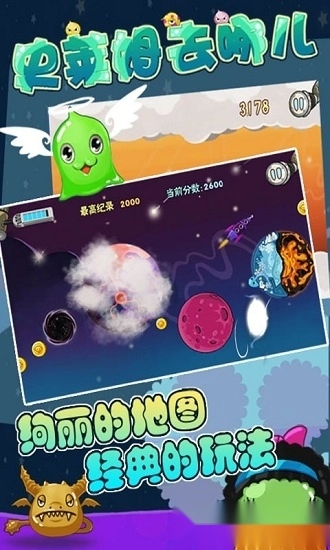在游戏里,当史莱姆进入特定范围时,点击屏幕就能让它跳到下一个星球。不过要是在星球上停留太久,它的体液会慢慢消耗,所以得赶在体液耗尽前跳往下一个星球。星球之间还会出现各种增益道具,这些道具能帮你跳得更远,还能获取更高分数呢。