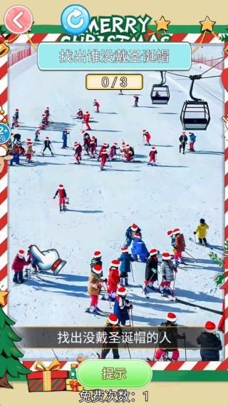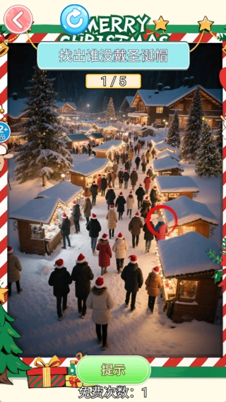 玩家需要在场景里找出没戴圣诞帽的人物,点击对应的人物即可完成标记,从而快速达成找茬任务。
