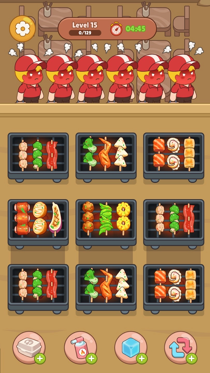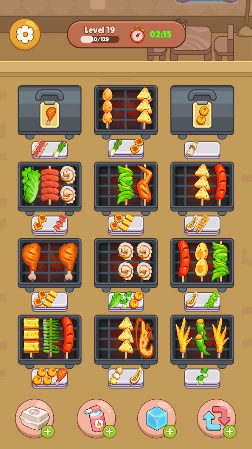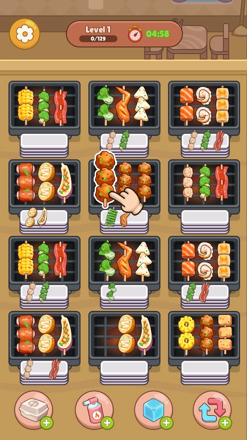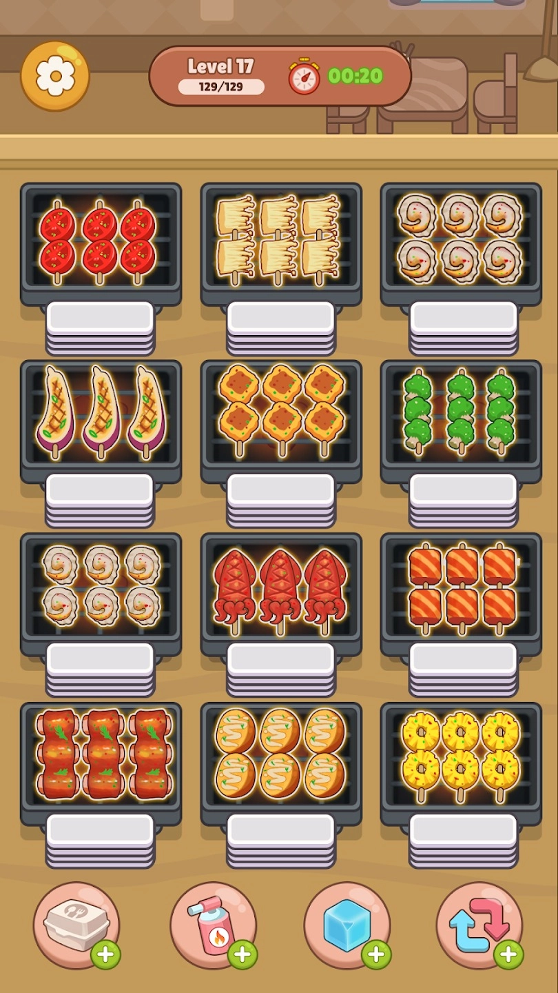 1.将经典三消玩法与烹饪元素相结合,玩家扮演烧烤大师,通过整理食材来完成关卡任务,既考验策略又充满趣味性。