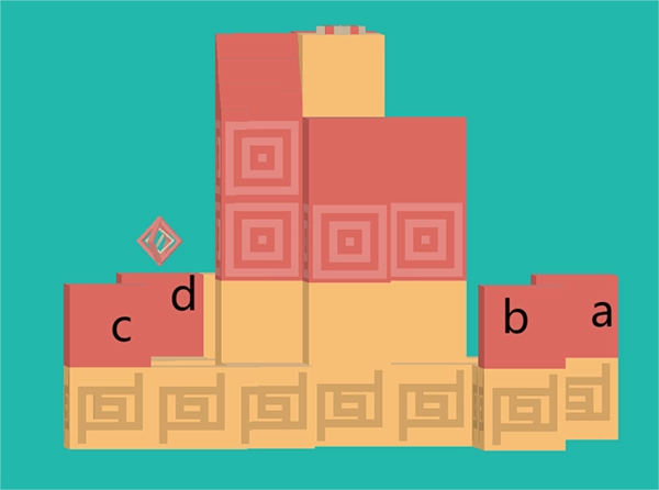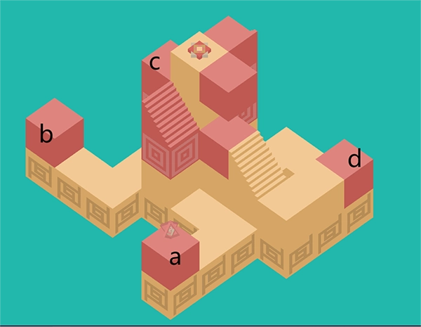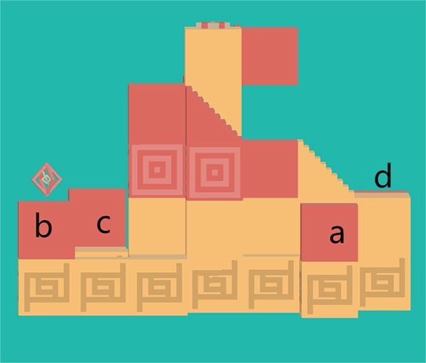 先给四个小红色区域分别标记为a、b、c、d,游戏开始时人物位于a区域。