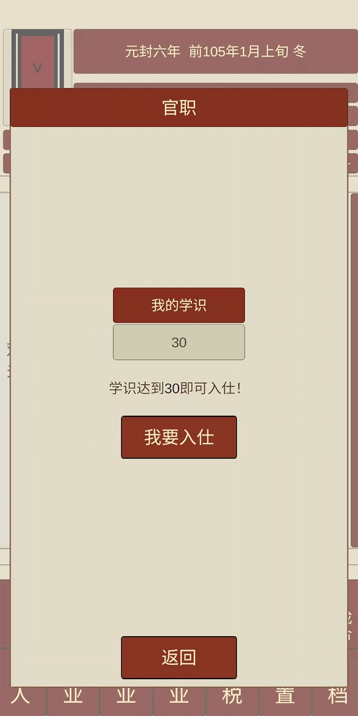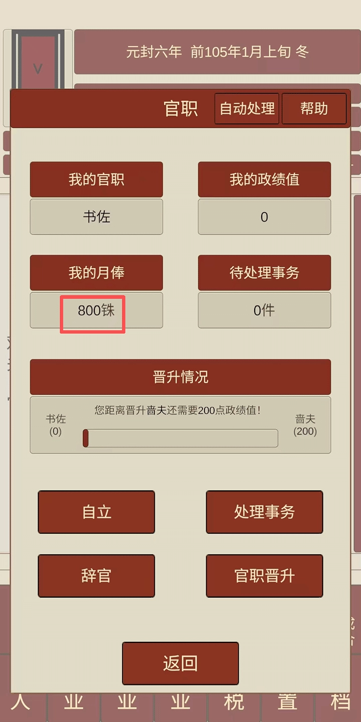 当学识积累到30点时,就能顺利踏入仕途,初始月俸为800,这笔收入足够维持家庭日常开销,不必再花费时间打理农田或是从事副业了。