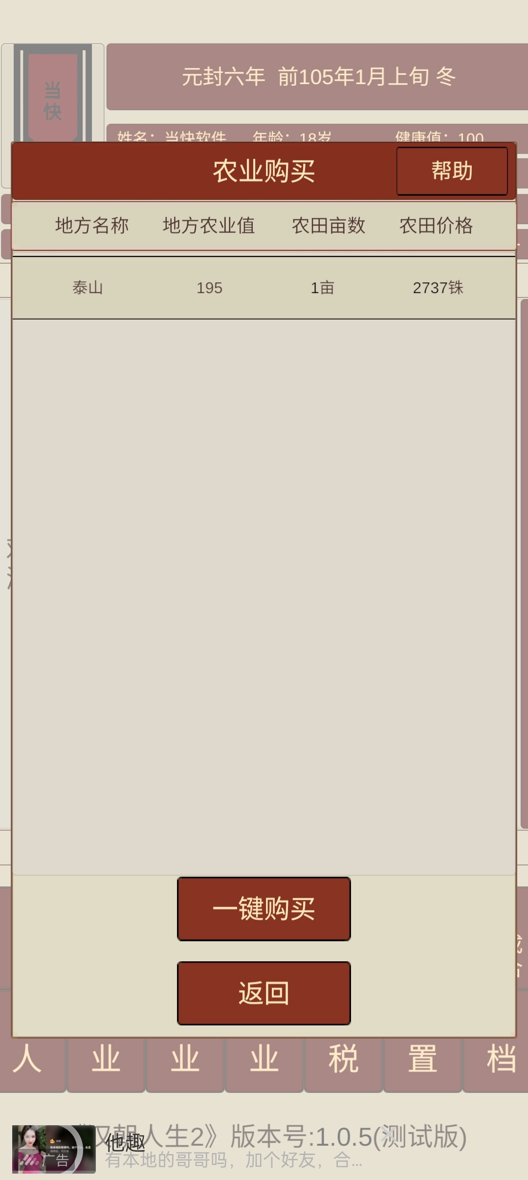 这款游戏以人物的成长历程和资源的合理管理为核心玩法。在游戏早期,玩家主要通过务农、打工、经商等方式,稳步积累粮食、钱财与人脉资源;进入中期后,则需要着重在科举考试、官场人脉搭建以及官职晋升等方面进行策略性投入;到了后期,玩法进一步拓展到产业并购、家族关系维系以及地位传承等更深层次的内容。