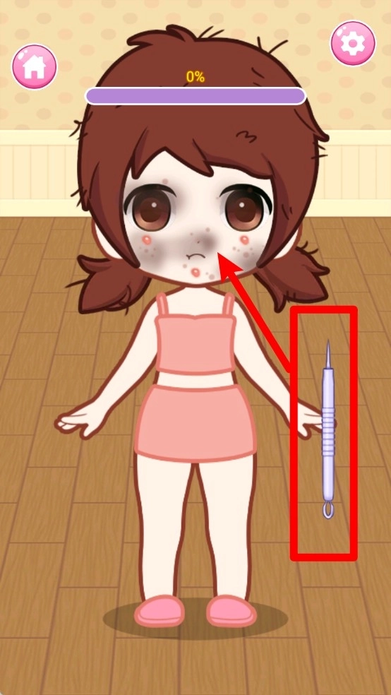 2.使用右侧工具清洁角色脸部的脏污与瑕疵,完成基础护理步骤,为后续的化妆与穿搭打下干净基础。