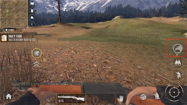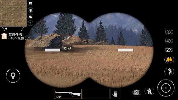 1、准星由屏幕中心区域控制,子弹从右下角发射,开镜功能在左下角;开镜后滑动镜头边缘可提升放大倍数,同时能在右下位置开启红外线;屏幕左右两侧均设有移动按钮,猎人可借此左右移动以寻找合适视角,不过移动范围相对有限。
