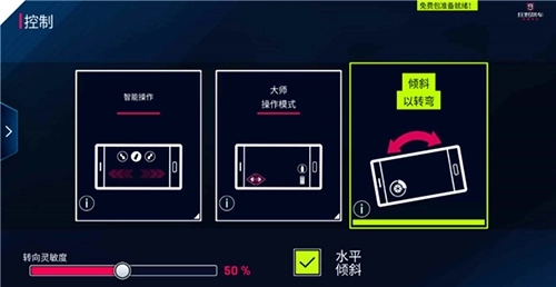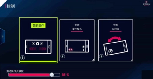 包括:智能操作、大师操作模式(触屏转向)以及重力感应操作模式,其中玩过狂飙8的资深玩家或是高级玩家才建议使用大师操作模式哦。