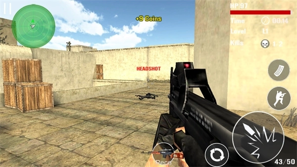 1、方向控制:用手指在触屏界面左下角任意滑动,就能操控枪械的射击准心移动,使其对准敌人。