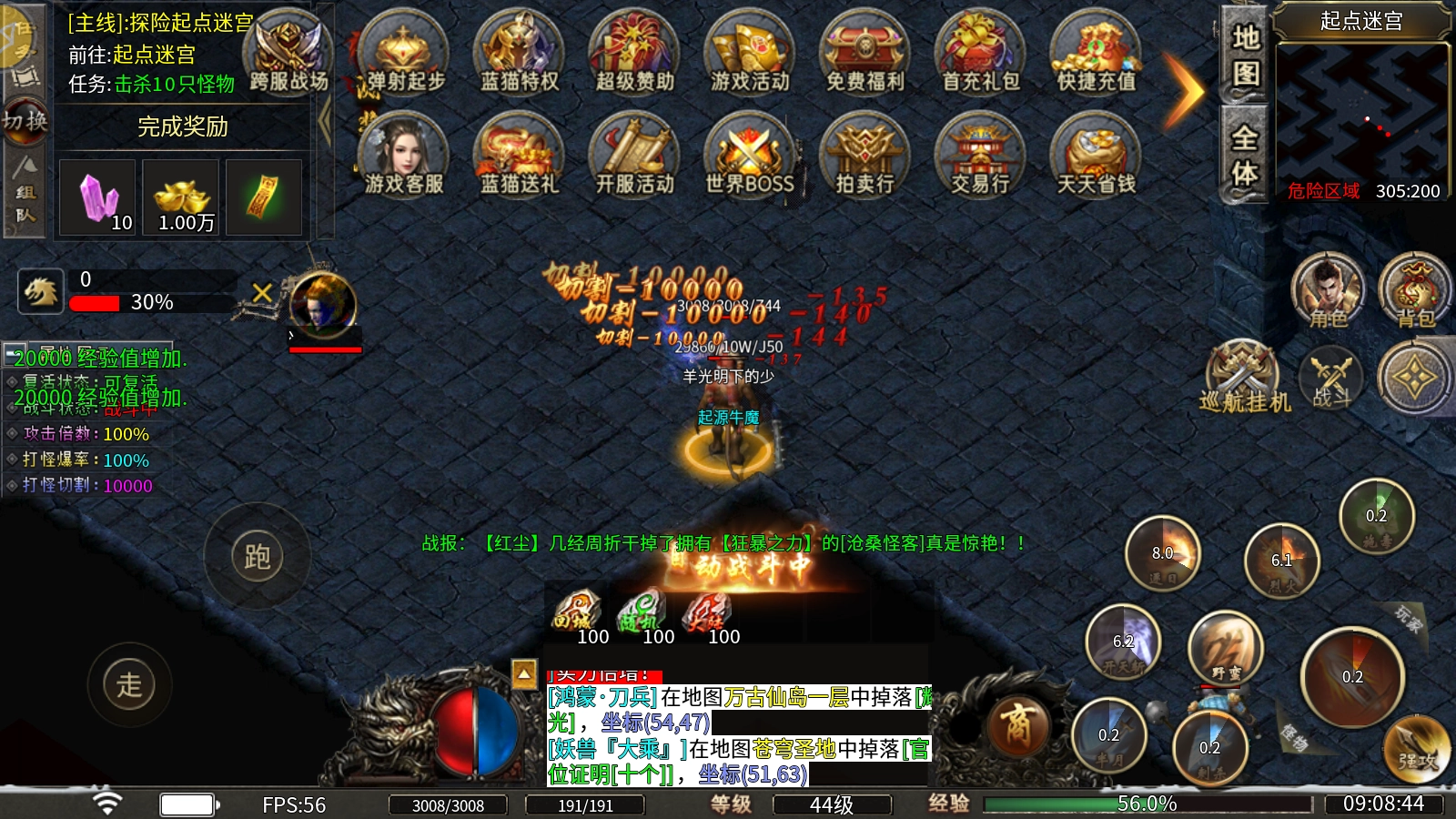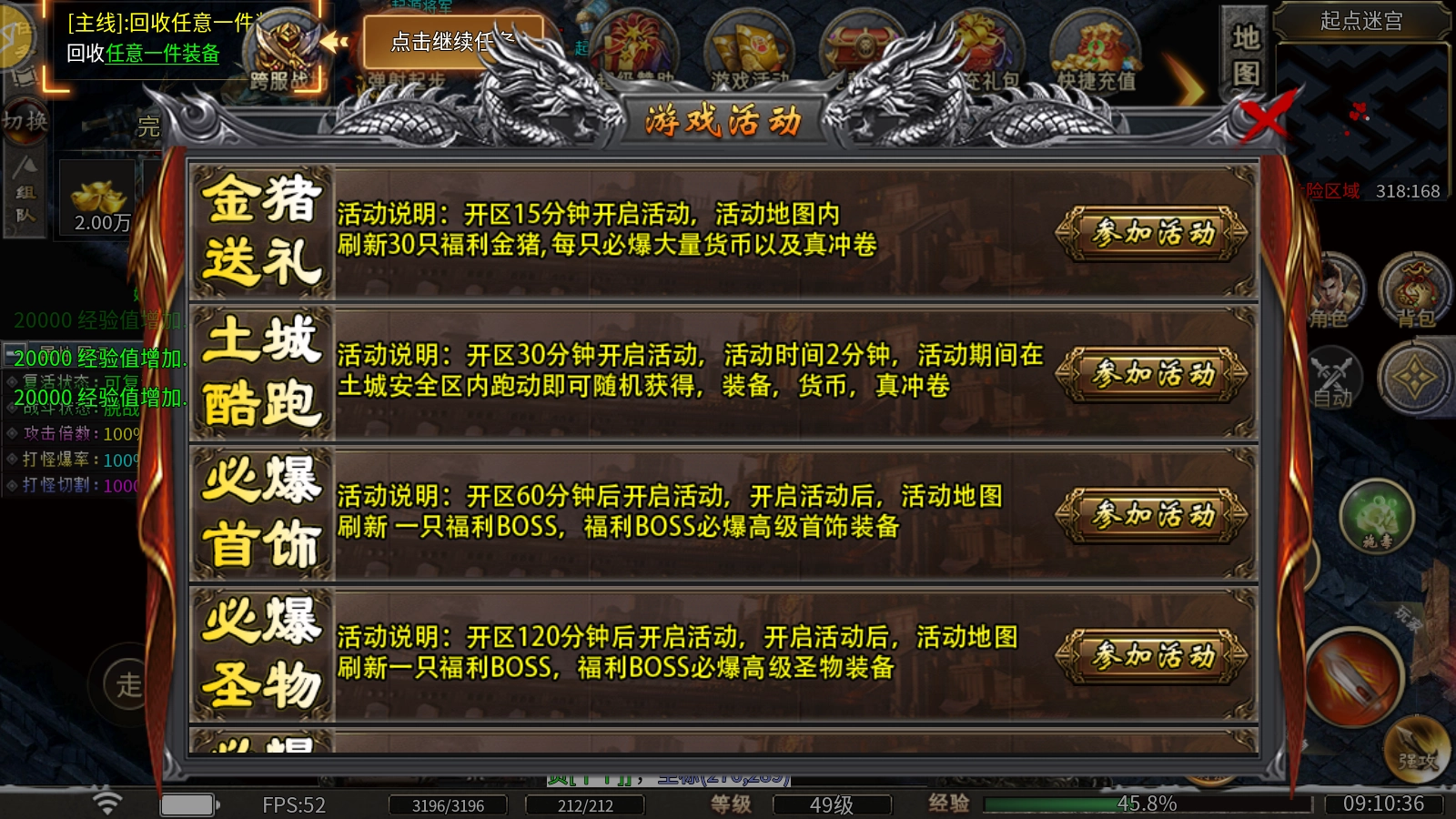 必出法器:开服240分钟后启动活动,活动开启后,活动地图会刷新一只福利BOSS,该BOSS必定掉落高级法器装备。