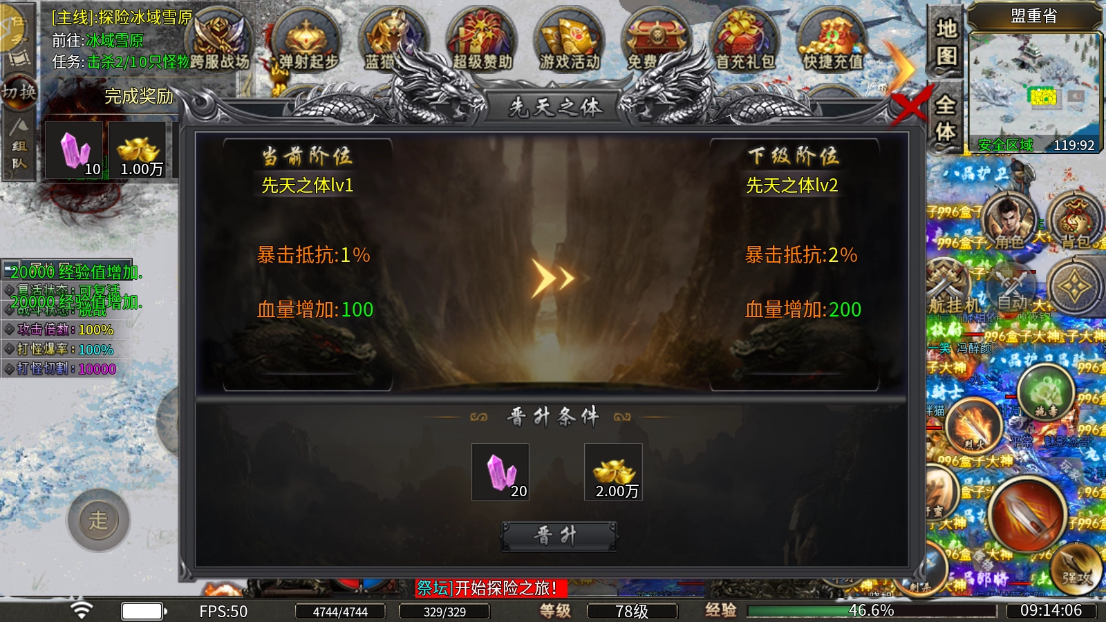 先天之躯:消耗冰雪碎块与元宝就能提升等级,每升一级不仅能增强暴击抵御能力,还能显著提高生命值上限。