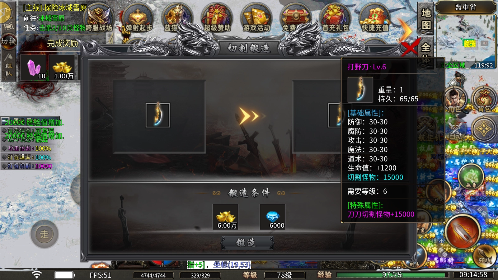 切割锻造玩法:消耗元宝与钻石就能对打野刀展开锻造,每提升一级,不仅可以增加切割伤害,还能获取攻魔道等全属性加成。