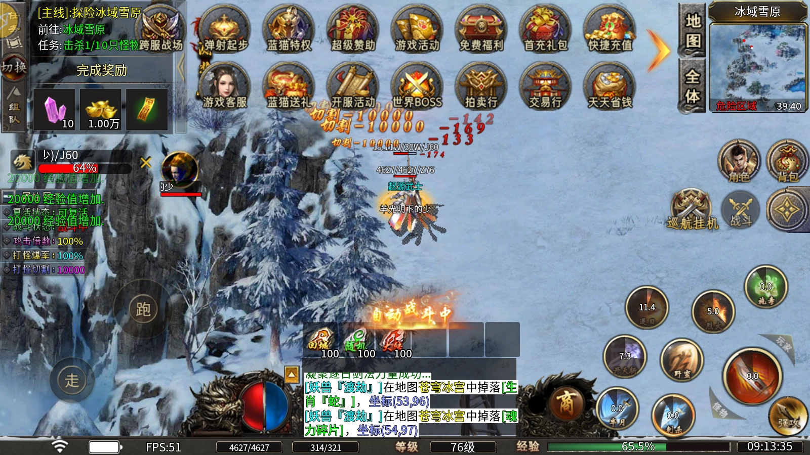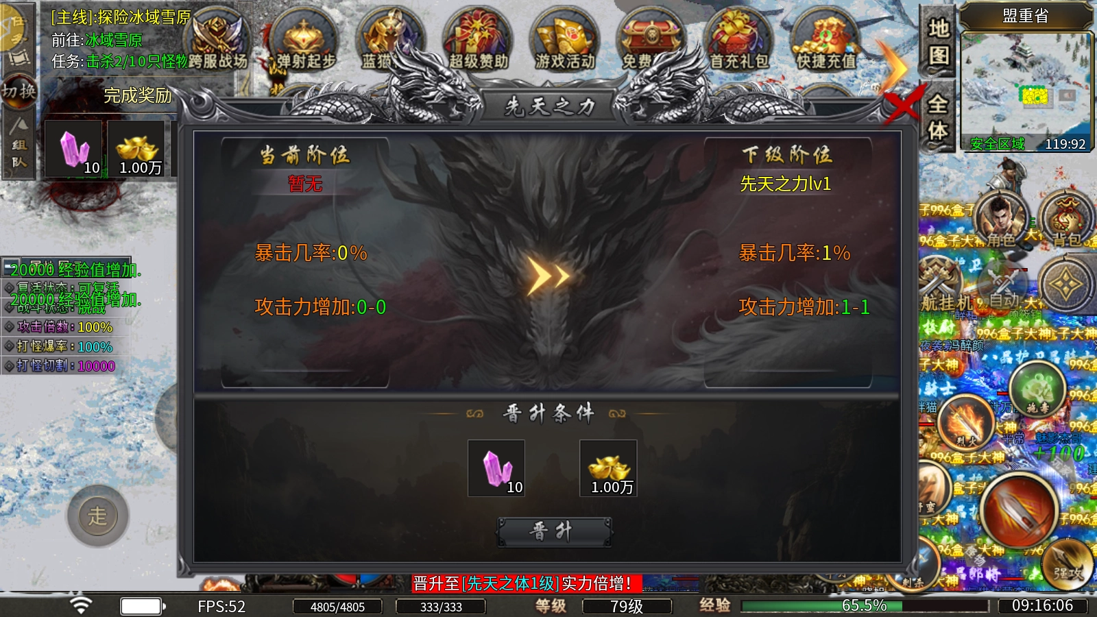 先天之力:消耗冰雪碎片与元宝即可完成晋升,可提升攻击力和暴击几率,从而提高打怪效率。