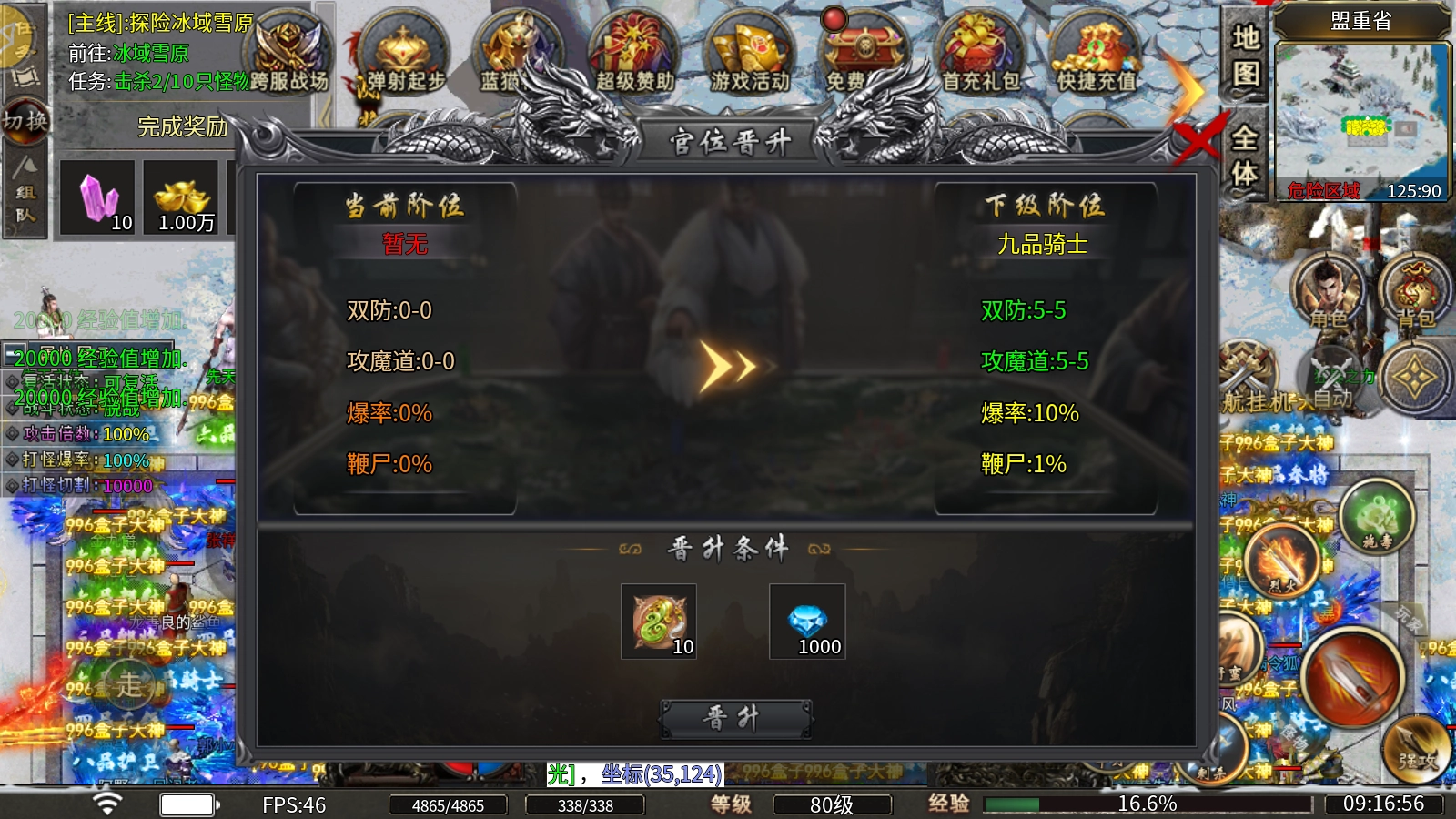 官位晋升的条件很简单,只要拥有小号钻石和官位证明就能完成晋升。晋升之后,不仅能增强双防以及攻魔道这些属性,还可以提升爆率,同时获得鞭尸的效果。