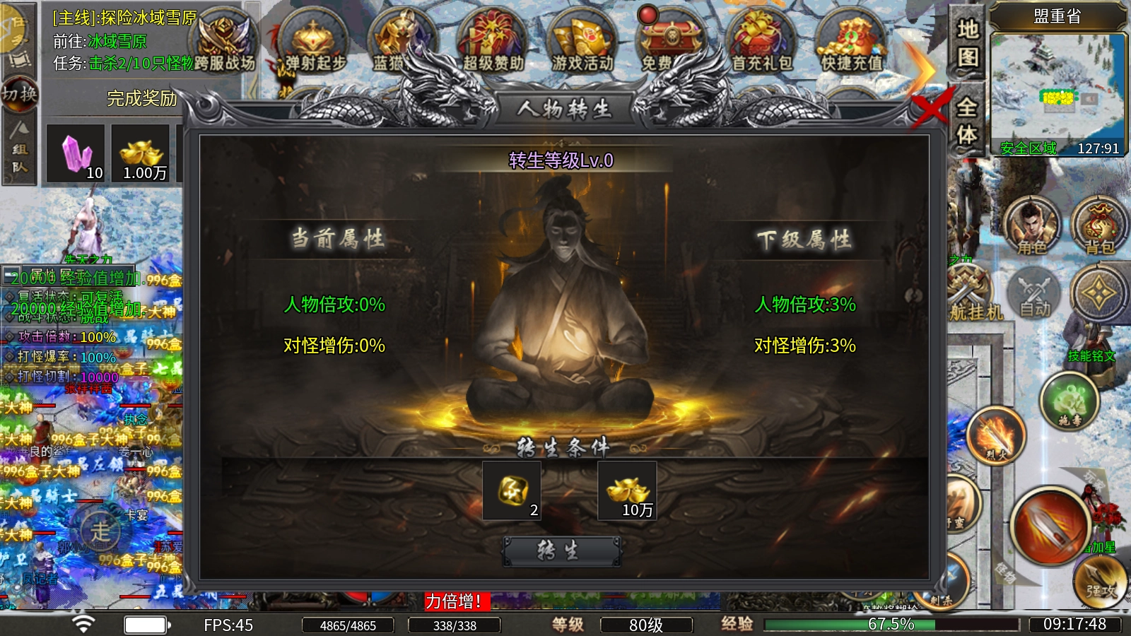 人物转生玩法:消耗转生石与元宝,即可完成人物转生操作,从而提升角色的倍攻属性以及对怪物的增伤效果。